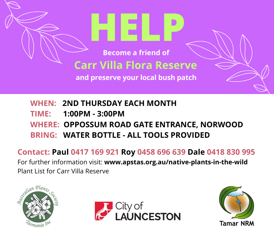 The Australian Plant Society of Tasmania, in collaboration with the City of Launceston and Tamar NRM, aims to restore and maintain this high biodiversity bushland reserve by preventing weed invasion and supporting native species revegetation.