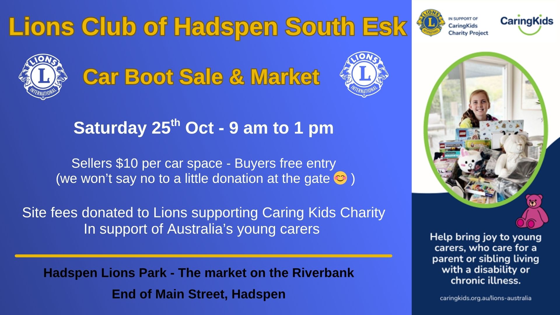 The Lions Club of Hadspen South Esk will be having their next Car Boot Sale and market on Sat the 25th Oct. Be sure to come down and grab a bargain.