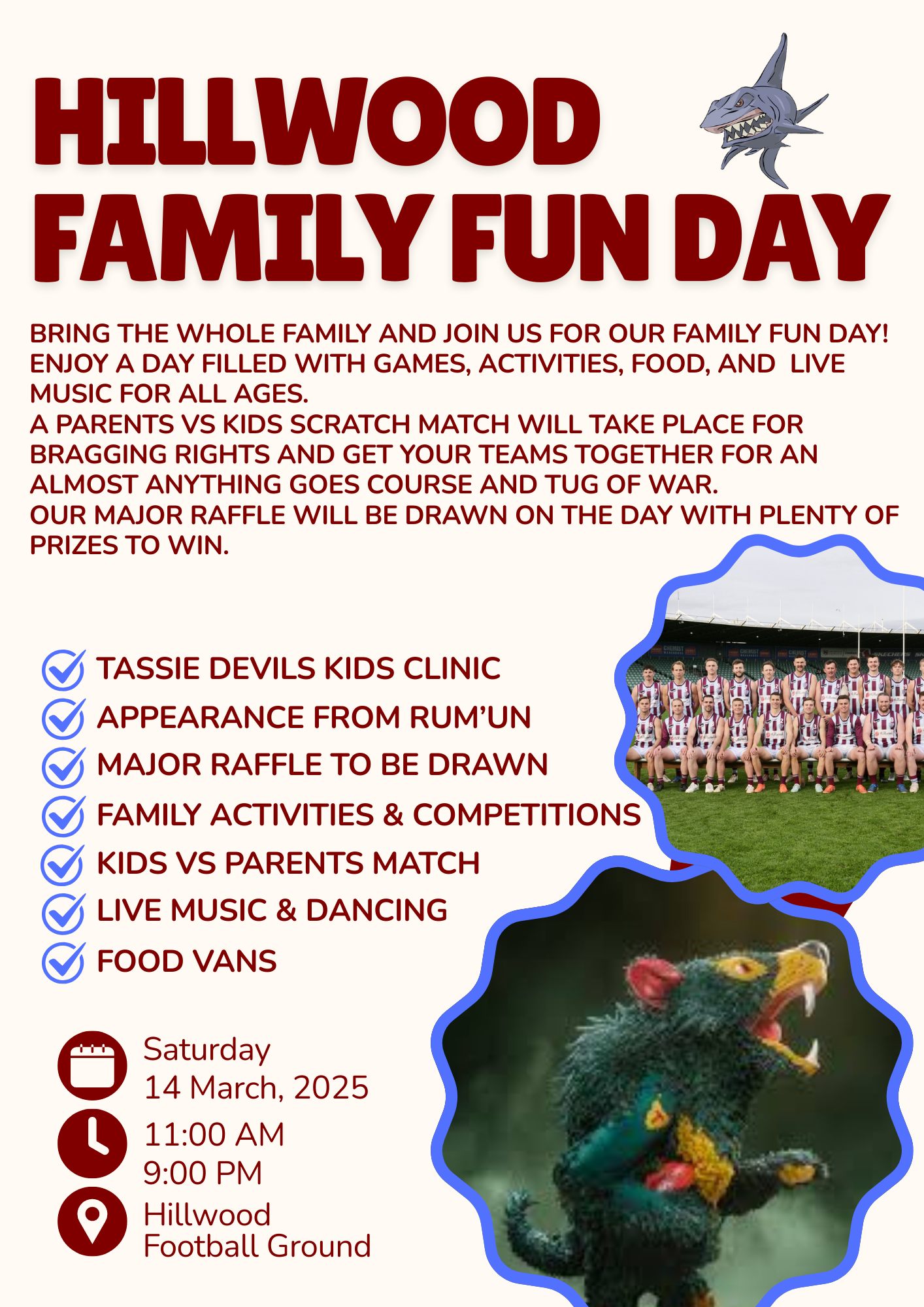 The Hillwood Football Club are celebrating their 100 year centenary in 2026. To kick off the celebrations we are hosting a FREE entry Family Fun Day. The Tassie Devils will be hosting a Kids Footy Clinic, Rummin the AFL Tas Mascot will be in attendance with plenty of opportunities for photo’s with him. We will be drawing a Major Raffle with the first prize being 2 tickets to the 2026 AFL Grand Final as well as other fantastic prizes. Live music, local dance groups performing, face painting, Tug-O-War, Almost Anything Goes, loads of kids activities, food vans and live music. Sure to be a fantastic day out for families.