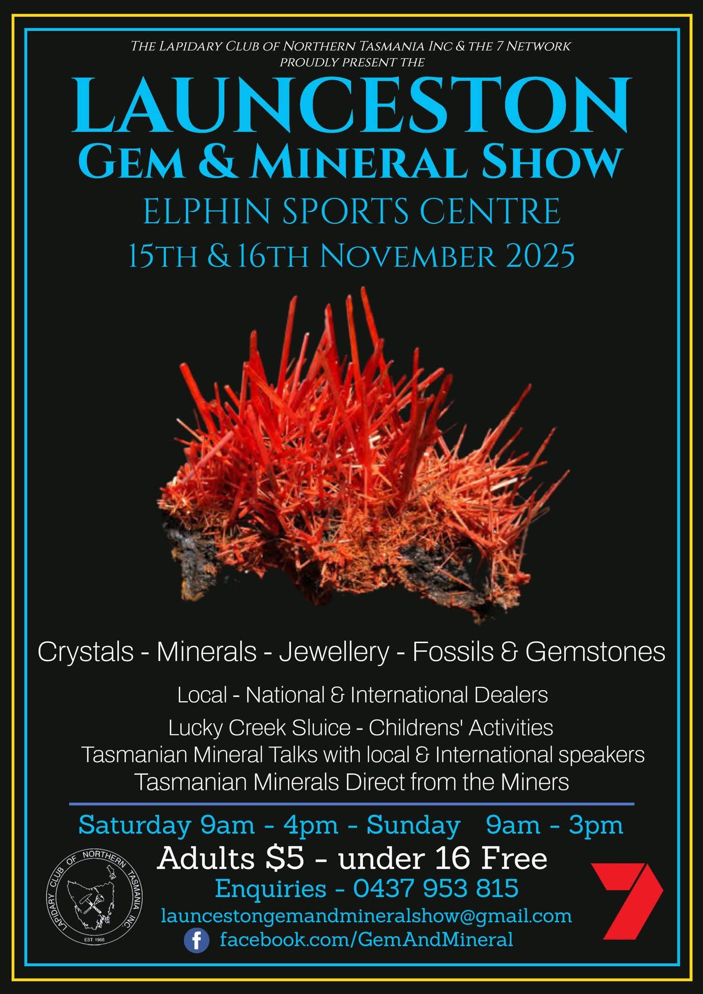 Launceston Gem and Mineral Show is an annual event with over 120 trade tables offering rocks, minerals, opals, carvings, crystals & jewellery. The two day weekend also hosts the Tasmanian Mineral Talks, with three guest speakers this year, the Lucky Creek Sluice, children’s activities, raffle & lucky door prize & so much more. Family friendly & accessible event