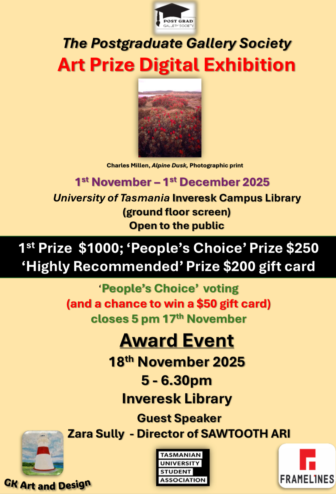 The Postgraduate Gallery Society Art Prize Digital Exhibition. Artworks by students, Alumni and community. Digital display on the screen in the library open for voting people’s choice award from 1st November, award announcement on 18th November at 5 pm – 6.30 pm.