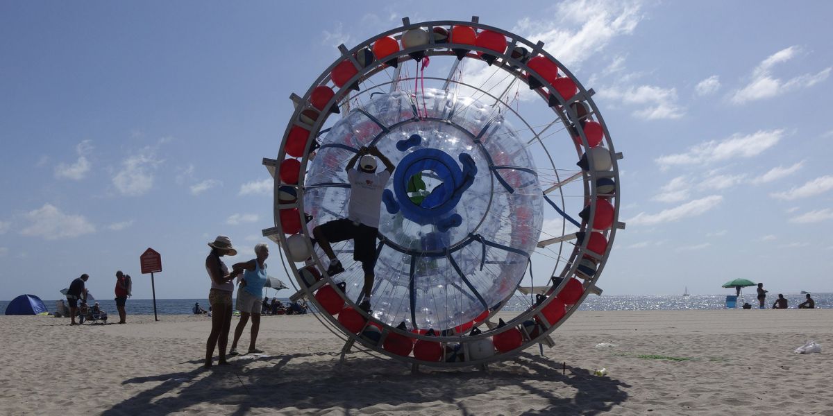 Baluchi’s most ambitious and peculiar projects involve crossing oceans in a “hydro pod”, a floating cylinder with paddles, propelled by his running inside it, akin to a giant hamster wheel.